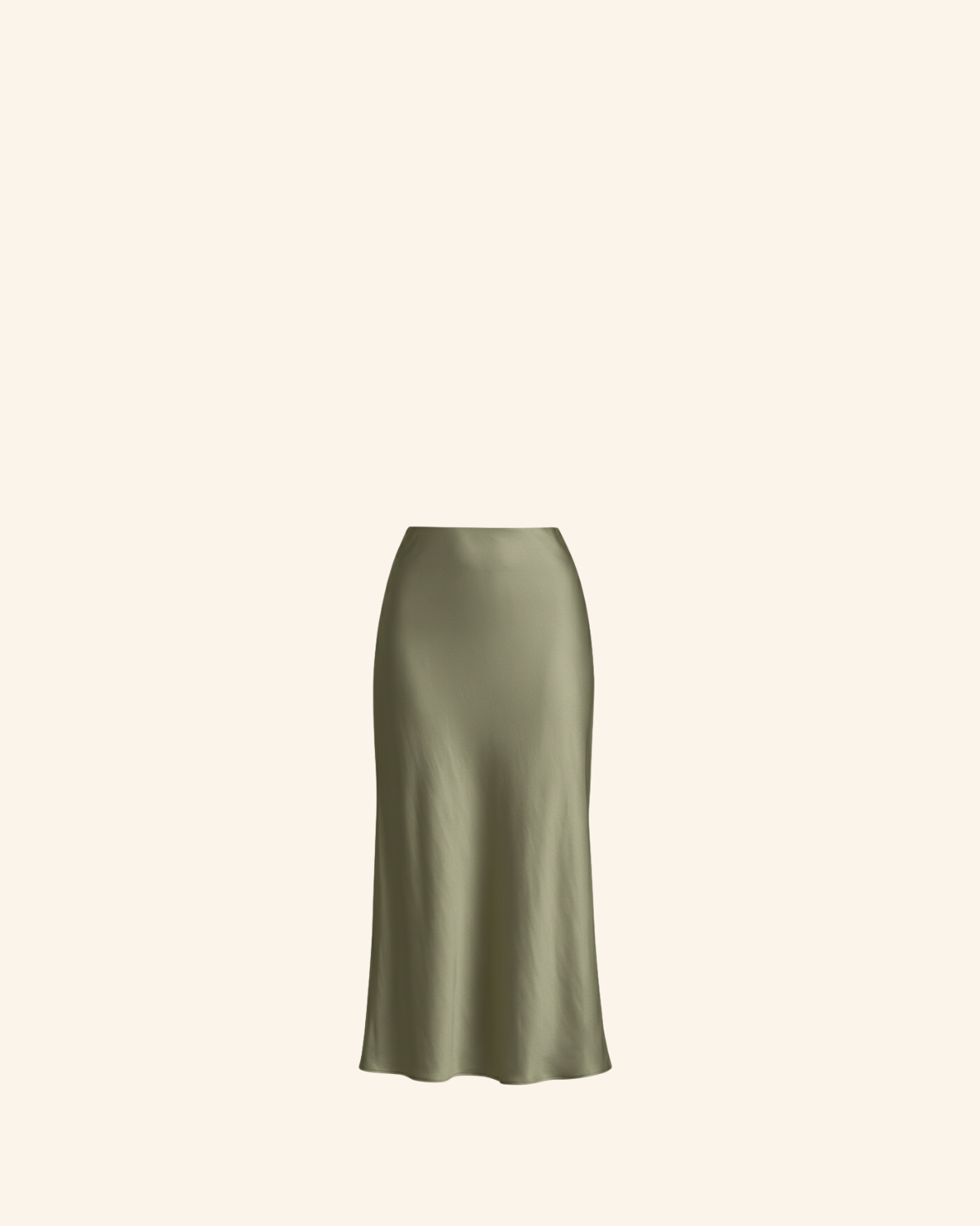 LUMINA / Olive Green Satin Midi Skirt – Bias Cut Elegance