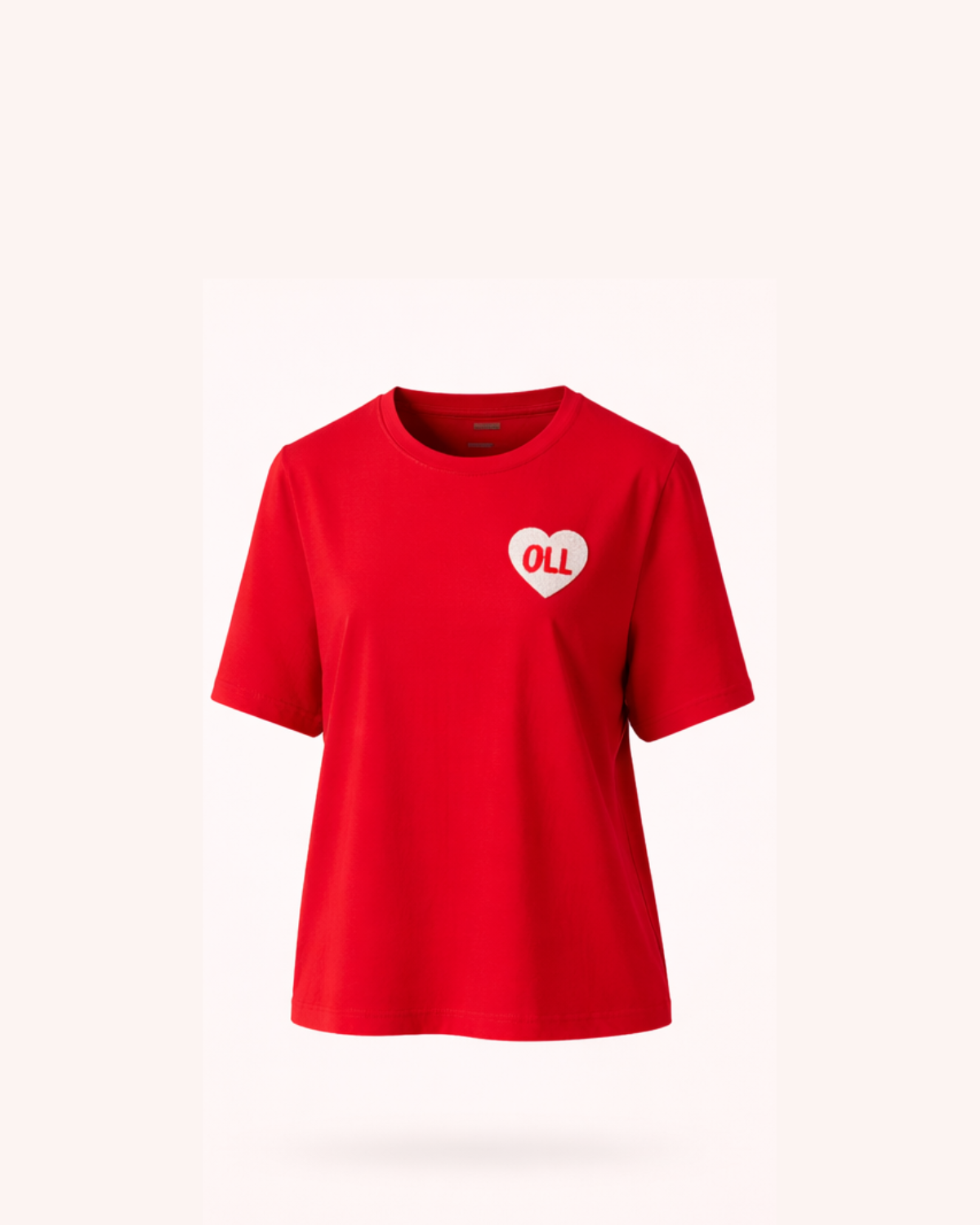 Fitted red ribbed knit top with a mock neck and short sleeves. A versatile everyday piece that works effortlessly with trousers or skirts.