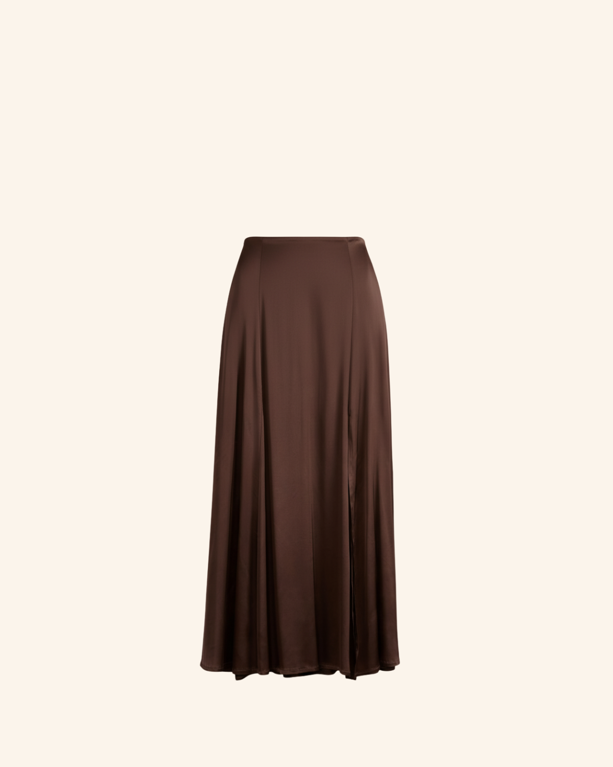 A beautifully draped satin midi skirt in deep burgundy, designed with a sleek bias cut that flatters every silhouette. Soft, fluid, and perfect for both everyday chic and evening elegance.